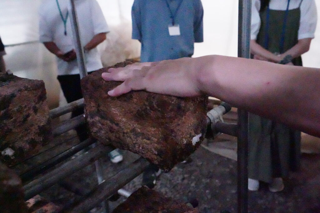 人間が、傷ができるとそれを治そうとするのと一緒です。シイタケ菌も、中でちぎれたところを治そうとして菌が寄ってくるんですよ。その寄ってくるところからシイタケが出てきます。なので、叩いたり、水に沈めたり、あとは今エアコン回っているんですが、菌床がちょっと乾いてきて、喉が渇いてきたなっていう時に、水をシャワーでかけてあげると程よくシイタケが出てきます。