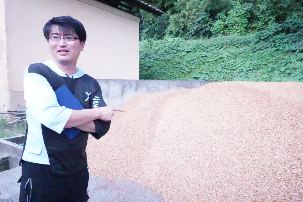 これは、シイタケの原料になる“オガ粉”と呼ばれるものです。原料は何の木でもいいってわけじゃなく、ナラの木ないしはシイノキ。うちが使っているのはコナラの木です。