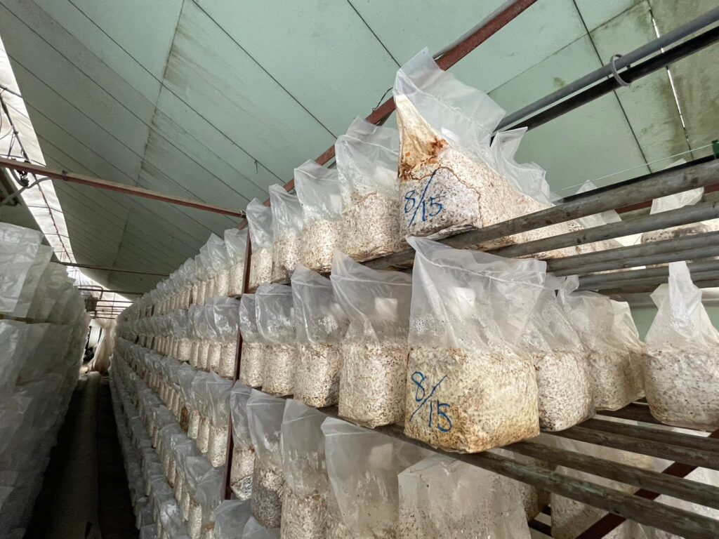 摂取室でできた菌床は、ハウスの中で養生します。これを培養って呼んでいます。主に1次培養と2次培養って呼ばれる工程がありまして、1次培養が菌を植えてからおおむね1ヶ月、2次培養で2か月強かかります。